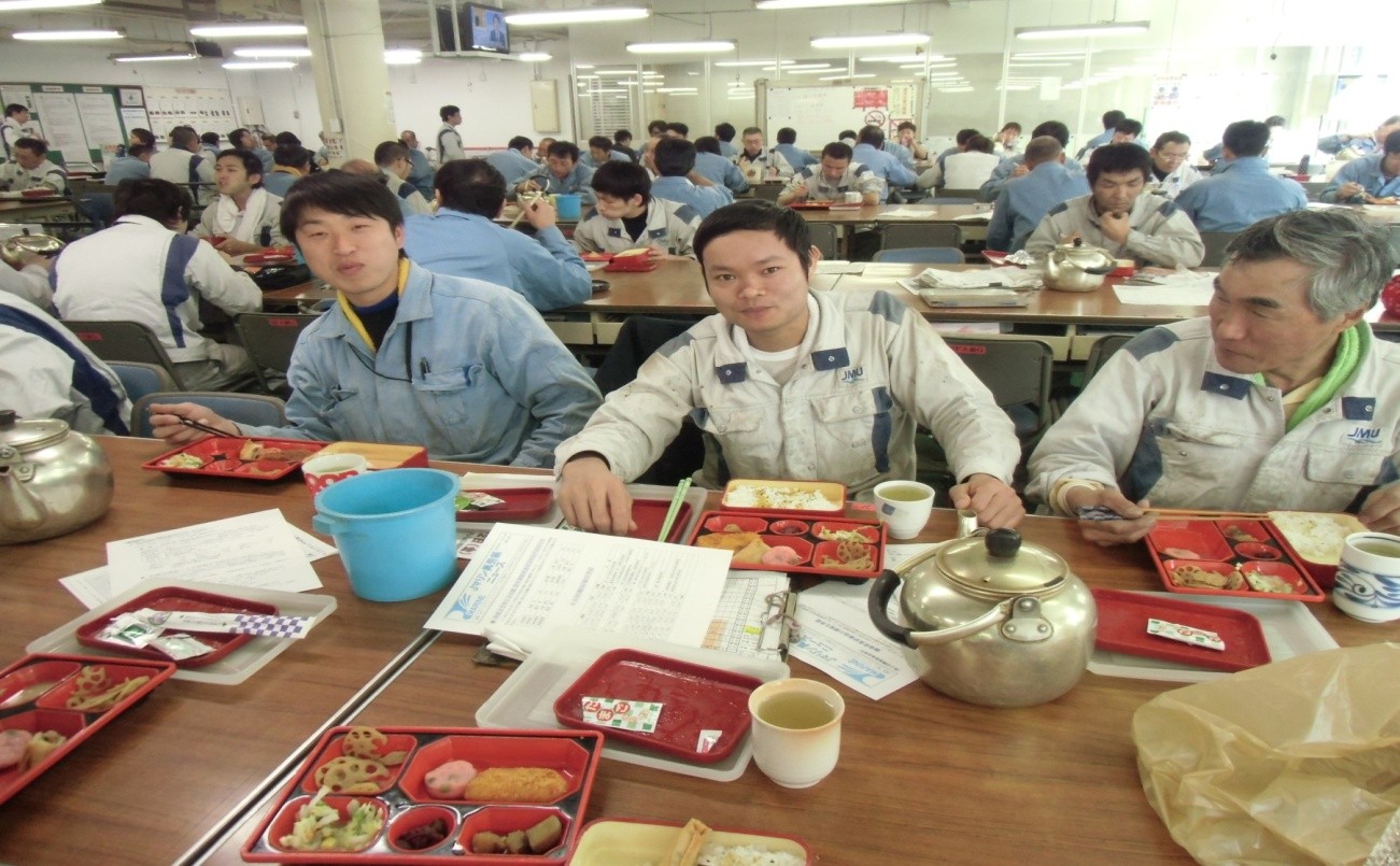 Tôi được nghỉ giải lao ăn trưa trong thời gian 1 giờ đồng hồ. Bữa trưa được Công ty chuẩn bị cho toàn bộ cán bộ, quản đốc và công nhân các phân xưởng. Tất cả đều ngồi ăn cùng nhau rất bình đẳng và vui vẻ. Những ngày đầu chưa quen khẩu vị của người Nhật, tôi ăn không hết suất nhưng khoảng 2-3 tháng sau tôi quen dần, mặt khác người Nhật có thói quen tiết kiệm, không lãng phí đồ ăn nên có hôm dù tôi ăn đã đủ no nhưng vẫn cố gắng ăn hết suất, không để thừa chút nào. Điều này cũng thể hiện sự tôn trọng giá trị sức lao động của bản thân và tôn trọng công sức làm ra của cải vật chất để có được bữa ăn cho mình.